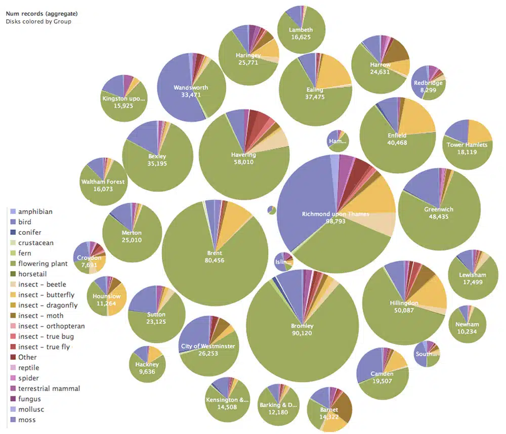 On closer inspection, the bubble diagram also reveals that the taxonomic breakdown for each borough varies considerably. The dataset for the majority of boroughs is dominated by plant records, thanks to the GLA habitat survey. This is particularly evident in Brent, where the Barn Hill Conservation Group have submitted an incredible 59,540 records from meadow surveys. In contrast, Wandsworth, Richmond and Camden all have significant amount of records for other taxonomic groups, reflecting the effort from borough and Royal Parks staff.