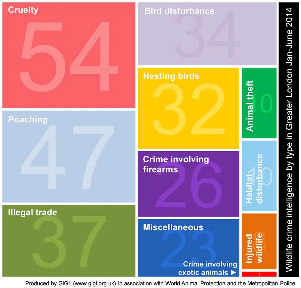 Over the last year, we’ve supported our partners with a range of numerical facts, figures and visualisations. Some of these have received widespread coverage, both on social media and in the printed press. One example is our work on the Reimagine London project for which one of our maps had a staring role in the Independent. We’ve also been instrumental in helping World Animal Protection to raise awareness of wildlife crime in London. As well as interactive maps, we produced infographics showing wildlife crime statistics which were used during World Animals Protection’s publicity campaigns.