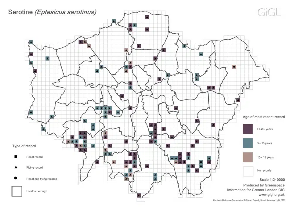 The atlas has already shown quite a few interesting trends. For example, the instance of the serotine bat seems to be concentrated to the south of London; Leisler’s bat roosts appear to be highly localised; and certain rare bat species have not been recorded in London for many years (e.g. barbastelle and Bechstein’s bat) despite potentially suitable habitat being present in some outer London areas.