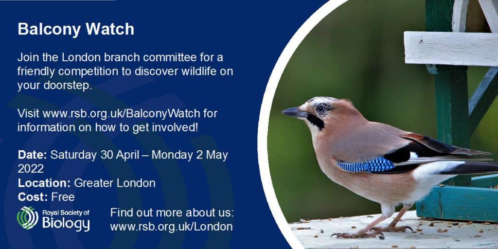 Following the success of Spring Watch on the BBC, which showed how the public can engage further with the wildlife around them, the RSB London Branch “Balcony Watch” seeks to engage both RSB members and non-members alike in a friendly competition to discover the wildlife on their doorstep. “Balcony Watch” applies to all those small private spaces from balconies and terraces to gardens within the Greater London area. The event will be run in collaboration with GiGL who will collect the data and add it to their ever-growing database. To read more about GiGL’s species data go to https://www.gigl.org.uk/species-data/.