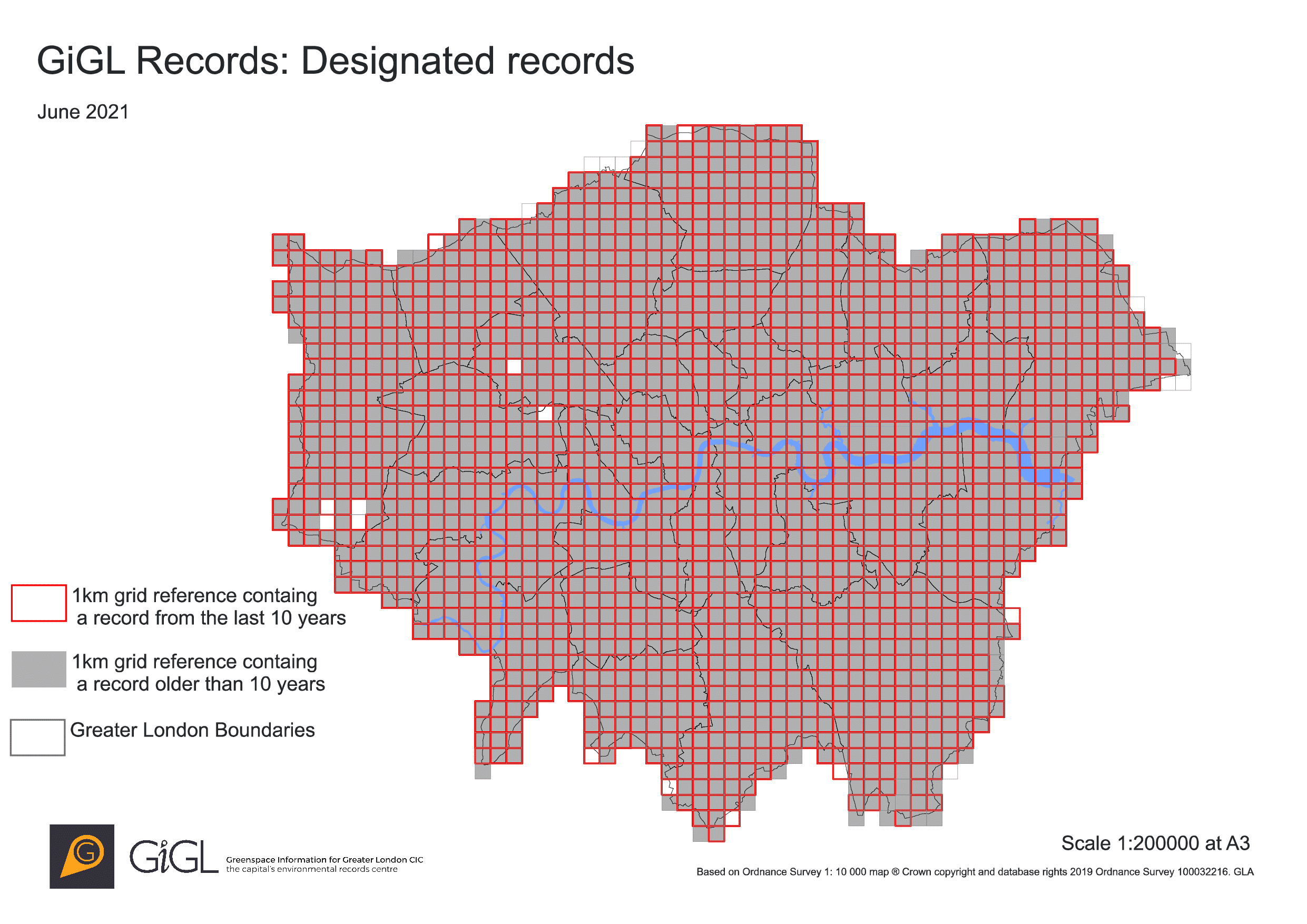 This map shows the importance of almost all of Greater London for designated and notable species, but also demonstrates the terrific work of London’s recording community. These GiGL records are informing decisions across London so it’s great there is such wide coverage. What about the 1km grid squares where no designated or notable species have been recorded, or where they have been found historically but not within the last 10 years? Do these areas not contain any designated or notable species, or is it that no-one has submitted any records from there? A challenge for London’s species recorders perhaps?